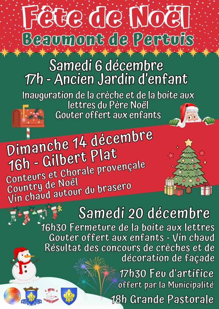 Samedi 20 décembre : Gouter et vin chaud, résultats des concours de crèches et de décorations de Noel, suivi du feu d’artifice offert par la mairie. Pastorale avec les animaux pour finir cette soirée.